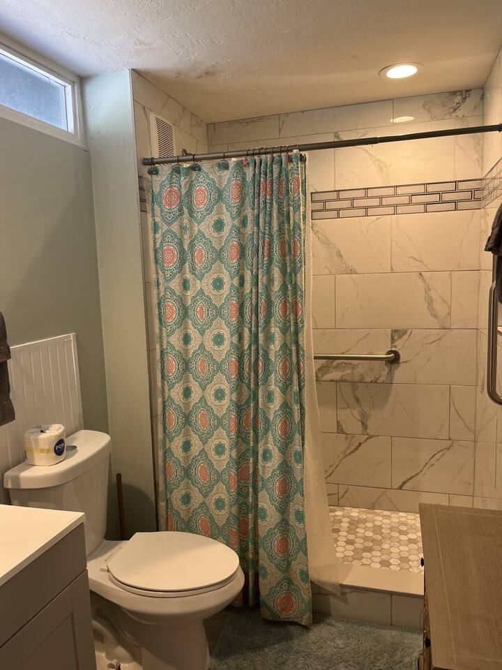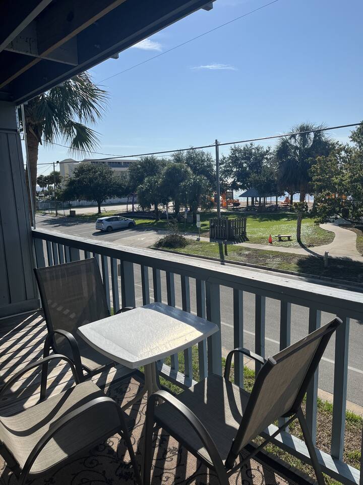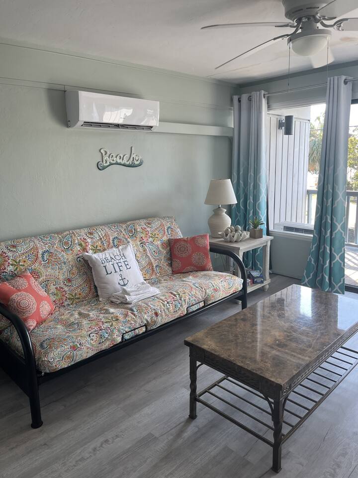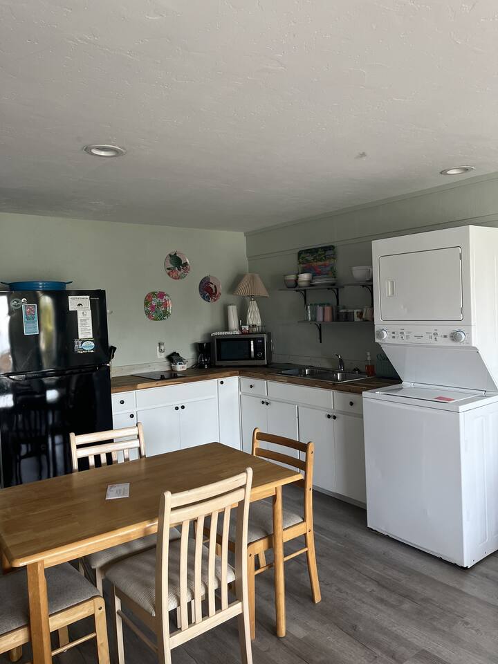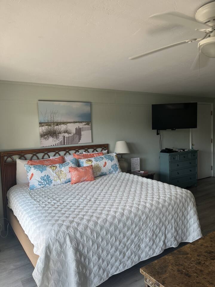 This lovely room offers you a king sized bed with a futon sleeper sofa for your additional guests. The kitchen has a 4 burner stove, microwave, coffee maker, toaster and refrigerator. See you soon! (2nd floor not wheelchair assessable)
