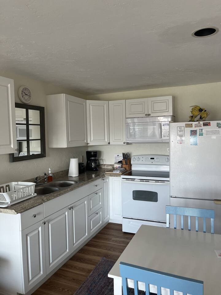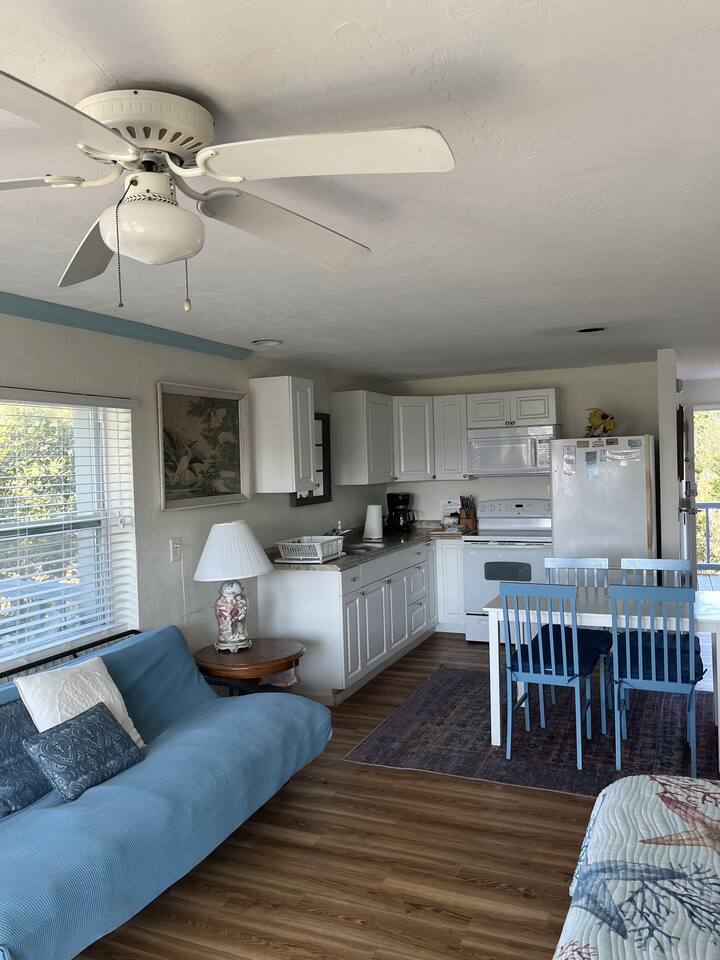 This corner unit has a newly renovated kitchen with an oven and bathroom with a WALK IN shower. New futon sofa for your overnight guests and a kitchen with a over, microwave, toaster, coffee maker and full refrigerator with an ice maker. The wrap around balcony gives you gulf views and down 2nd street. See you soon! (2nd floor not wheelchair assessable)